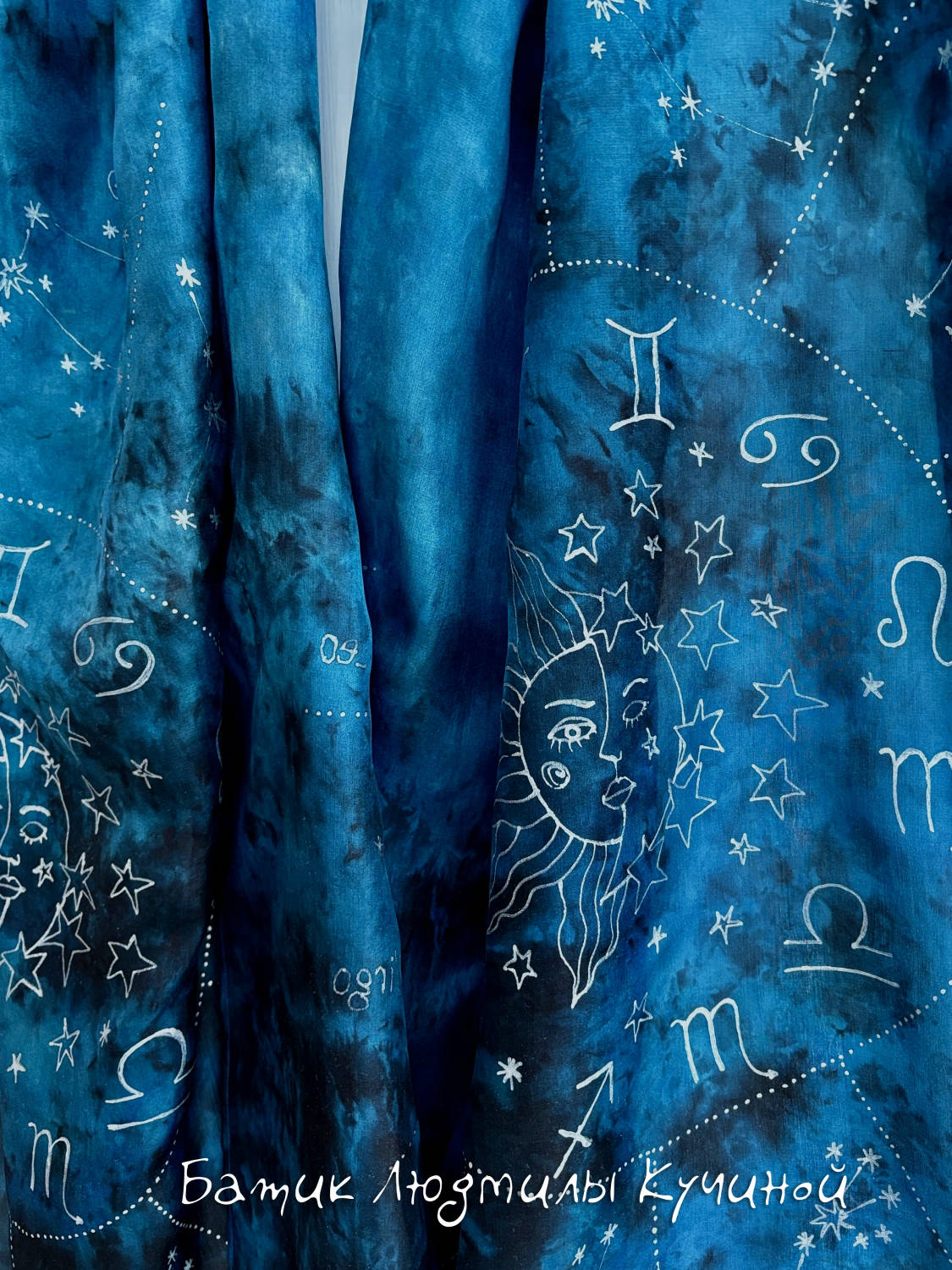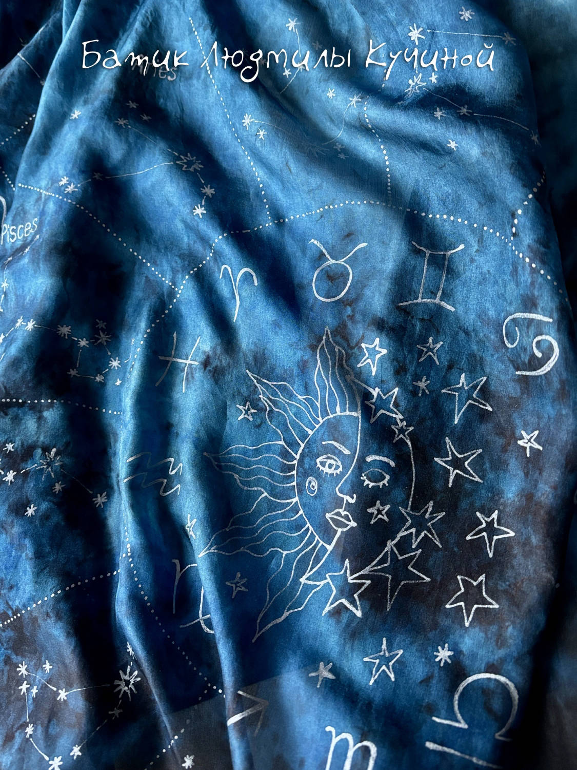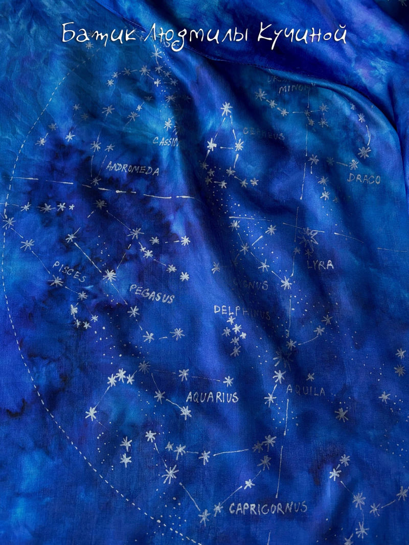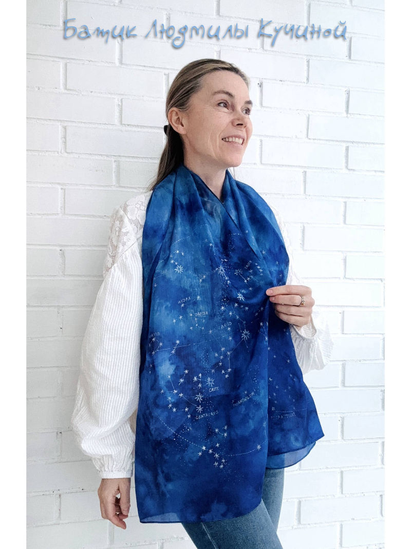 Батик шарф "Звездное Небо" ок 160Х48 см, тонкий натуральный шелк, серебристый контур. На шарфе много созвездий (с двух сторон разные ), среди них можно найти Льва, Близнецов , Рака, Козерога и Стрельца. Цена 3800р