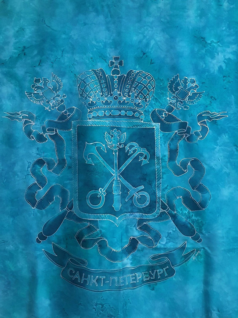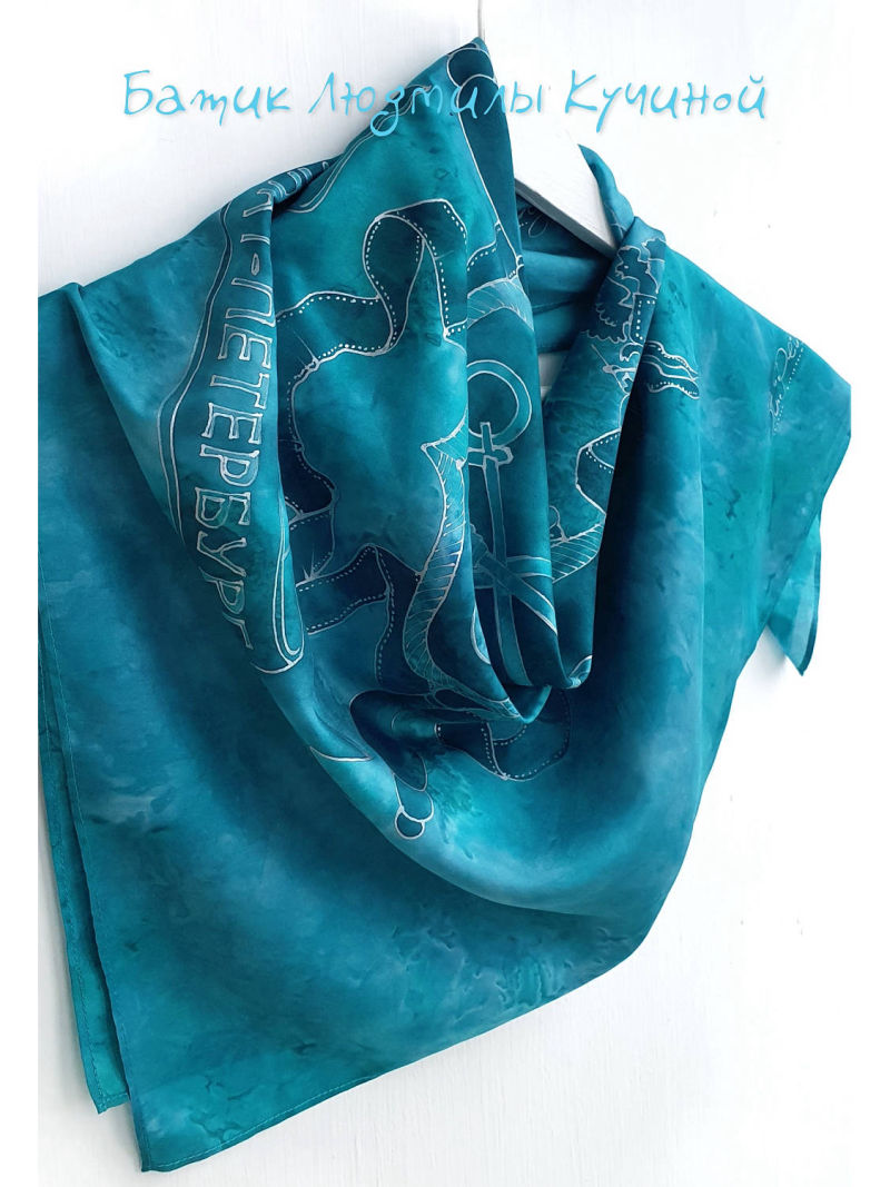Батик платок "Герб Петербурга" 70*70, натуральный шелк туаль, серебристый контур. Цена 4700р