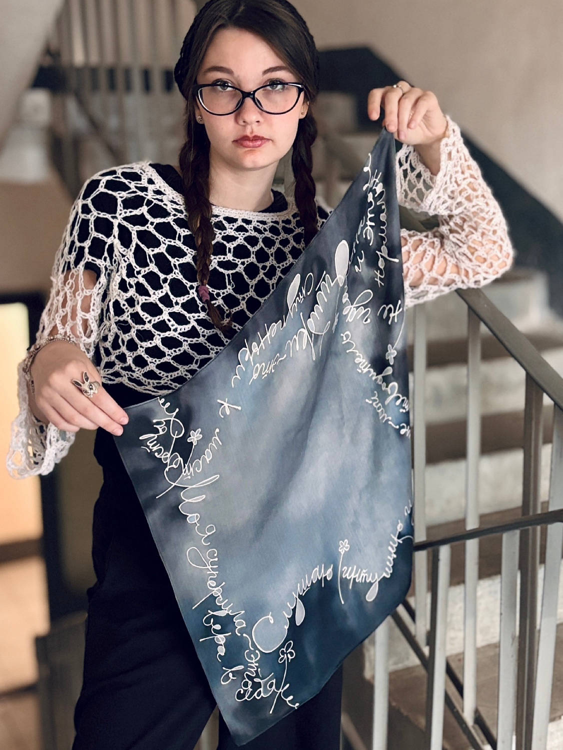 Платок "Благодарна Вселенной" 55*55, натуральный шелк атлас 4990р. Шарф "Я не идеальна" 184*15, натуральный шелк атлас 2990р . Галстук -шарф 181*4, 1990р. Топ сеточка - 2900р.