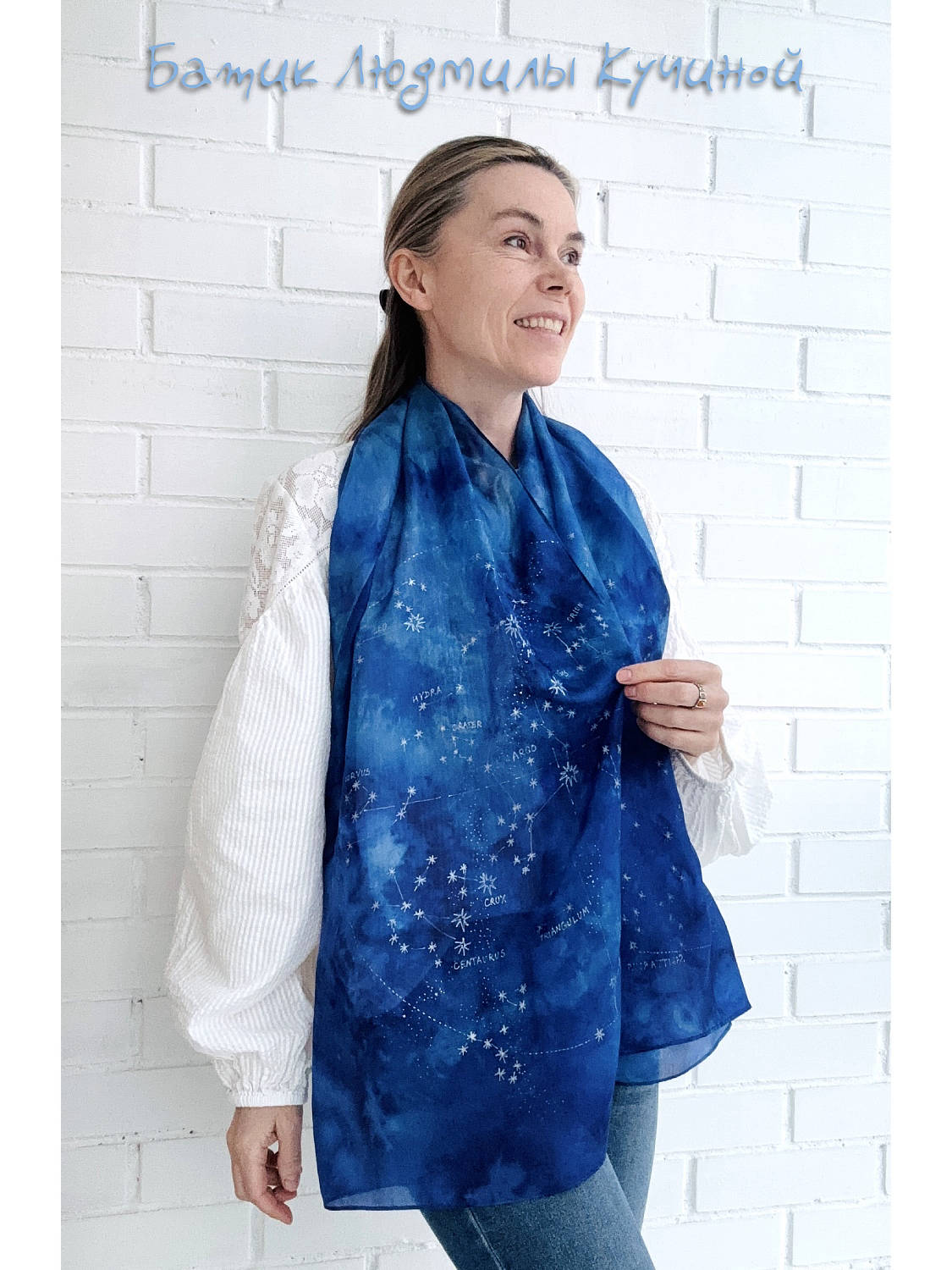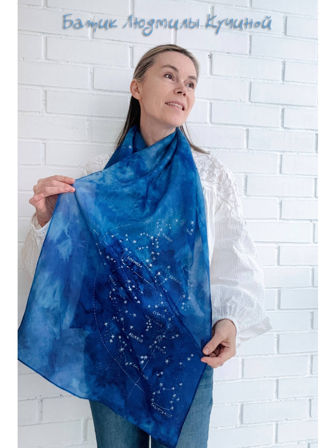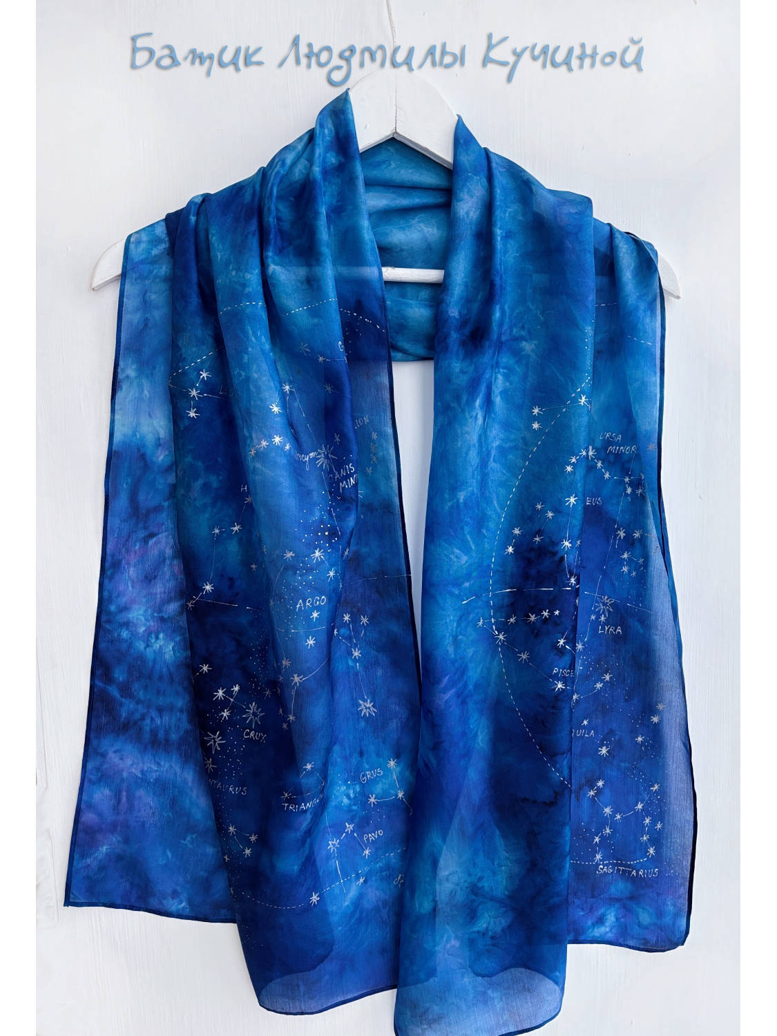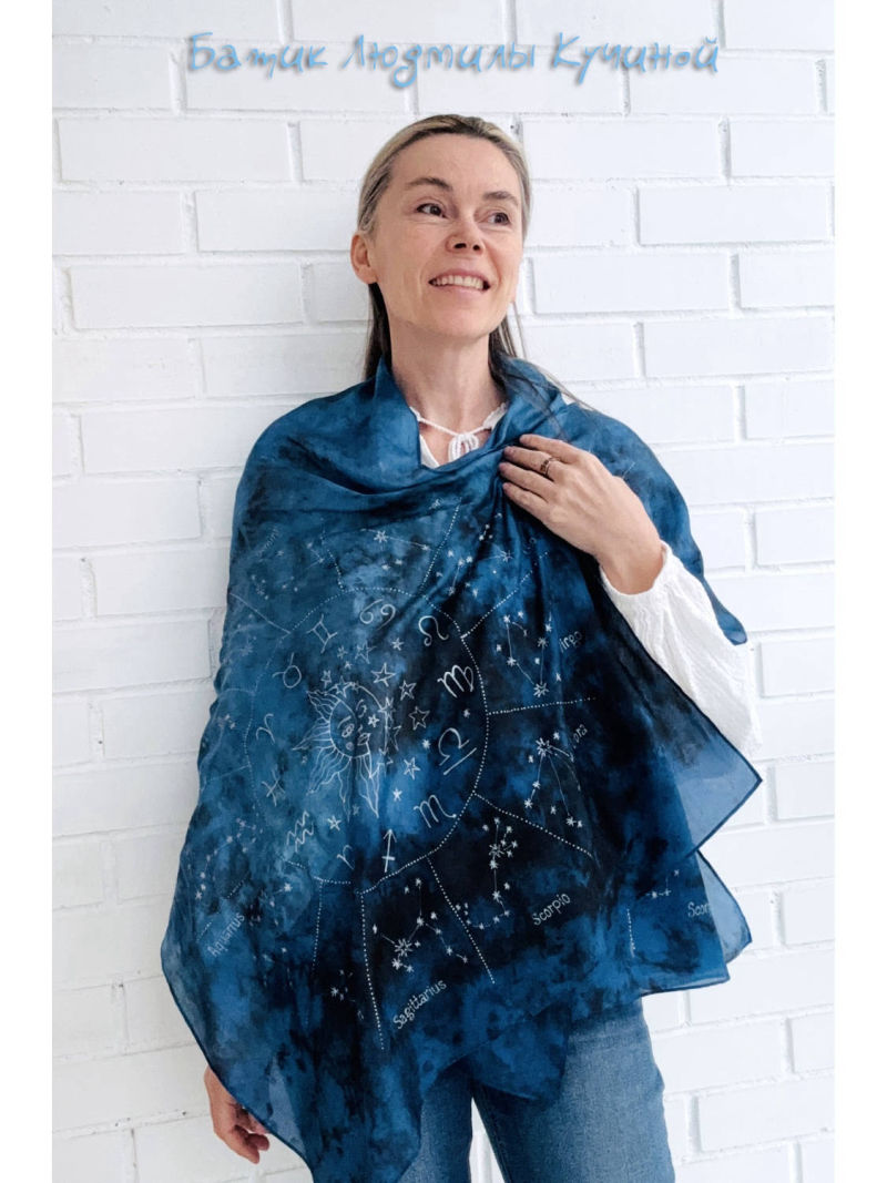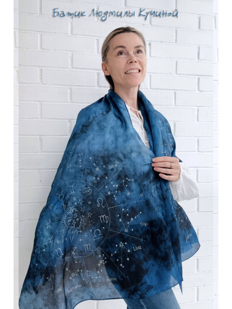 Батик шарф "Звездное Небо" ок 160Х48 см, тонкий натуральный шелк, серебристый контур. На шарфе много созвездий (с двух сторон разные ), среди них можно найти Льва, Близнецов , Рака, Козерога и Стрельца. Цена 3800р