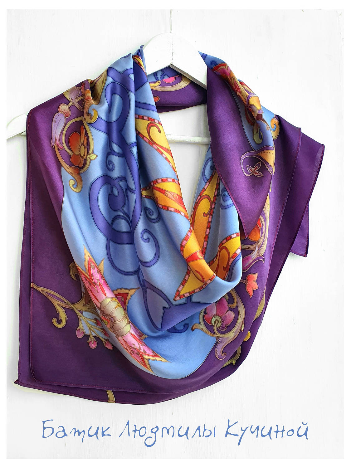 Роспись выполнена полностью вручную. Край обработан аккуратной машинной строчкой шелковой нитью под цвет.