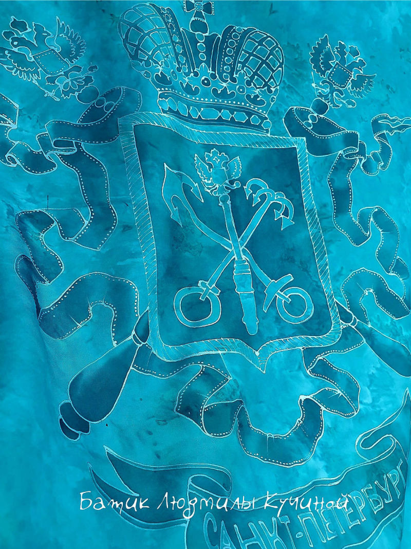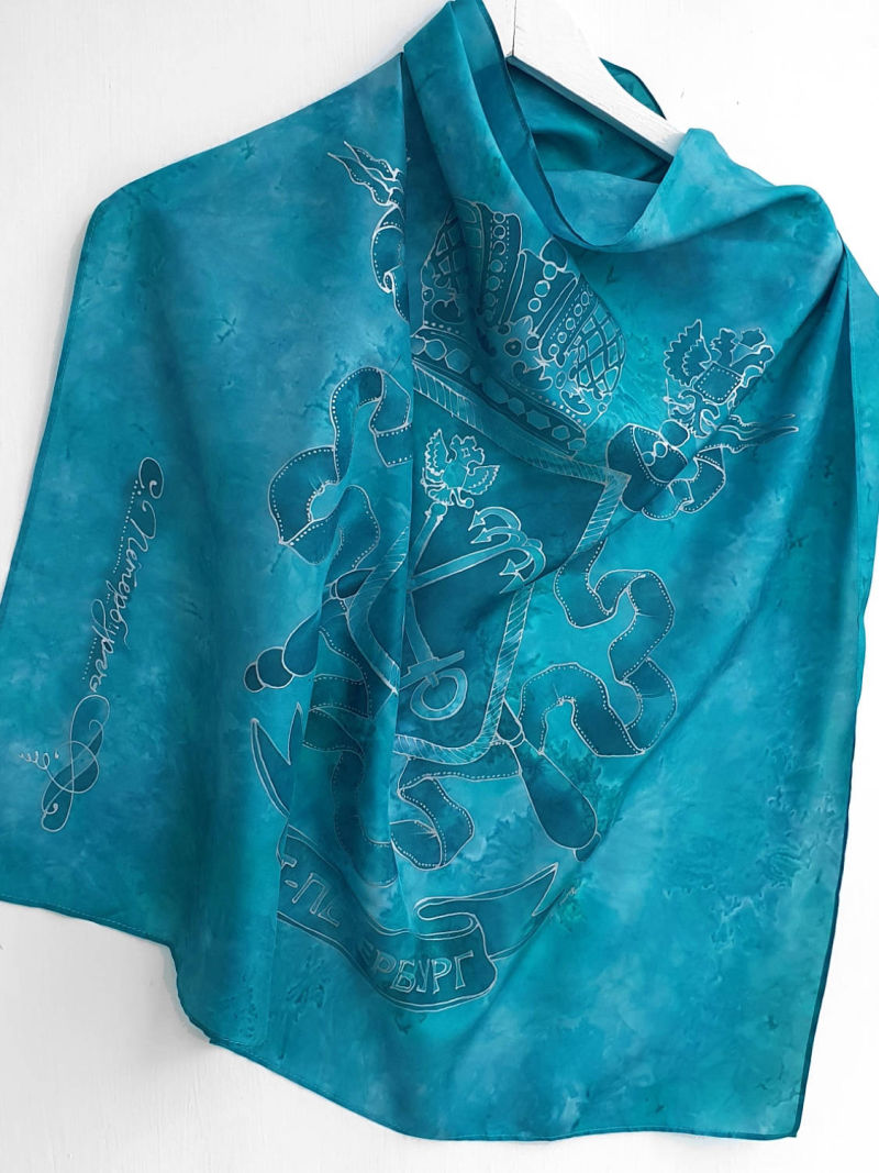 Батик платок "Герб Петербурга" 70*70, натуральный шелк туаль, серебристый контур. Цена 4700р