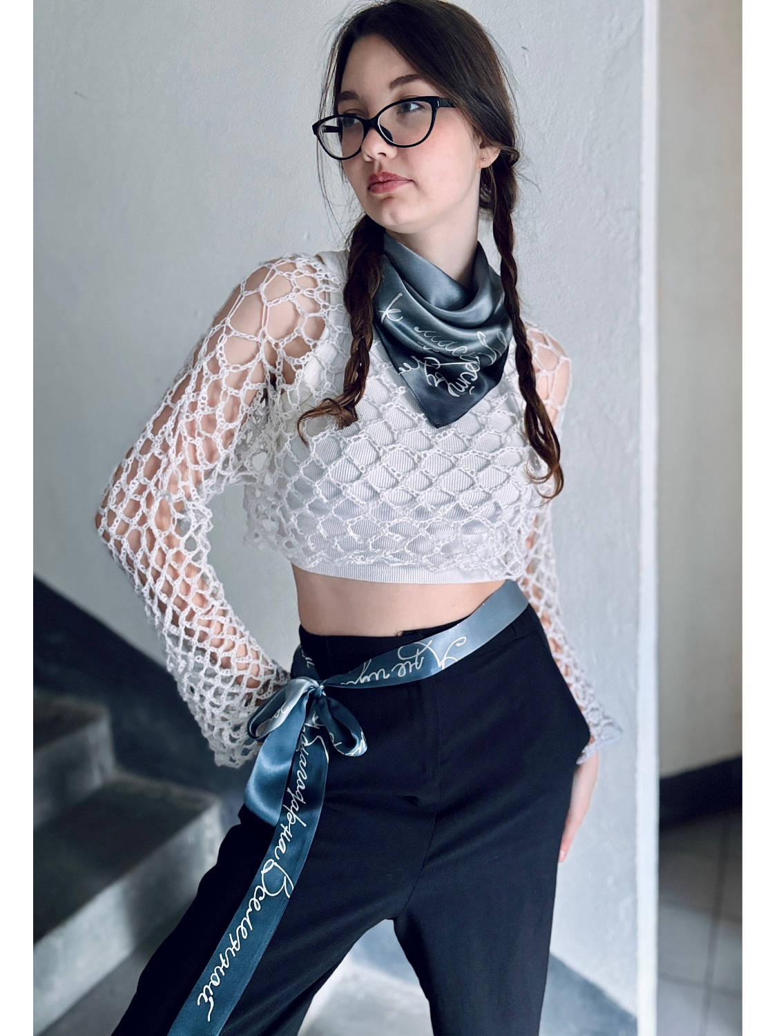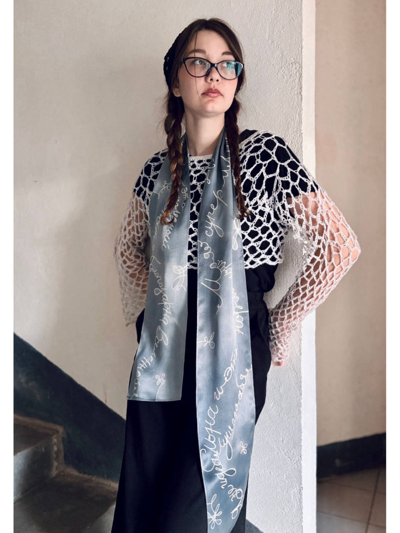 Платок "Благодарна Вселенной" 55*55, натуральный шелк атлас 4990р. Шарф "Я не идеальна" 184*15, натуральный шелк атлас 2990р . Галстук -шарф 181*4, 1990р. Топ сеточка - 2900р.