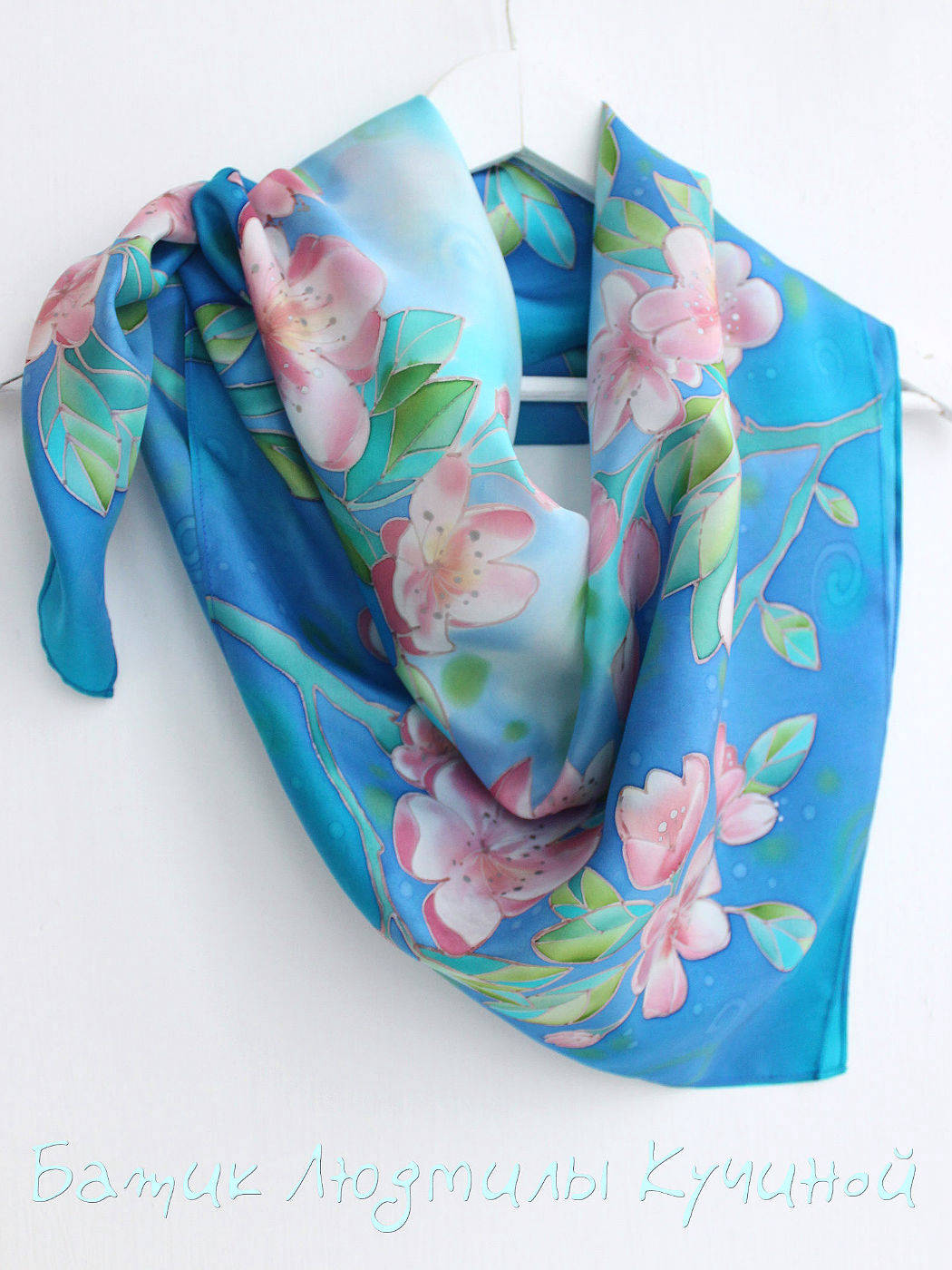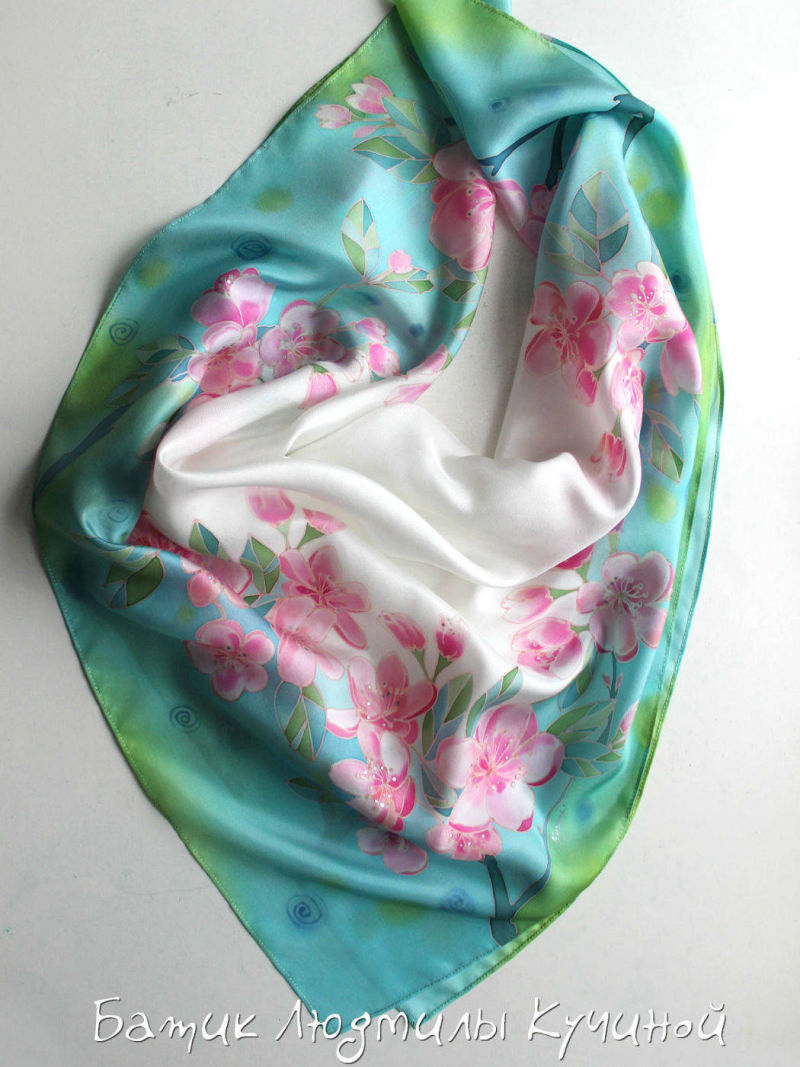 Батик платок "Яблоневый цвет" 90х90 см, шелк туаль, серебристый контур на тычинках. Возможны вариации цветовой гаммы. Повтор возможен.