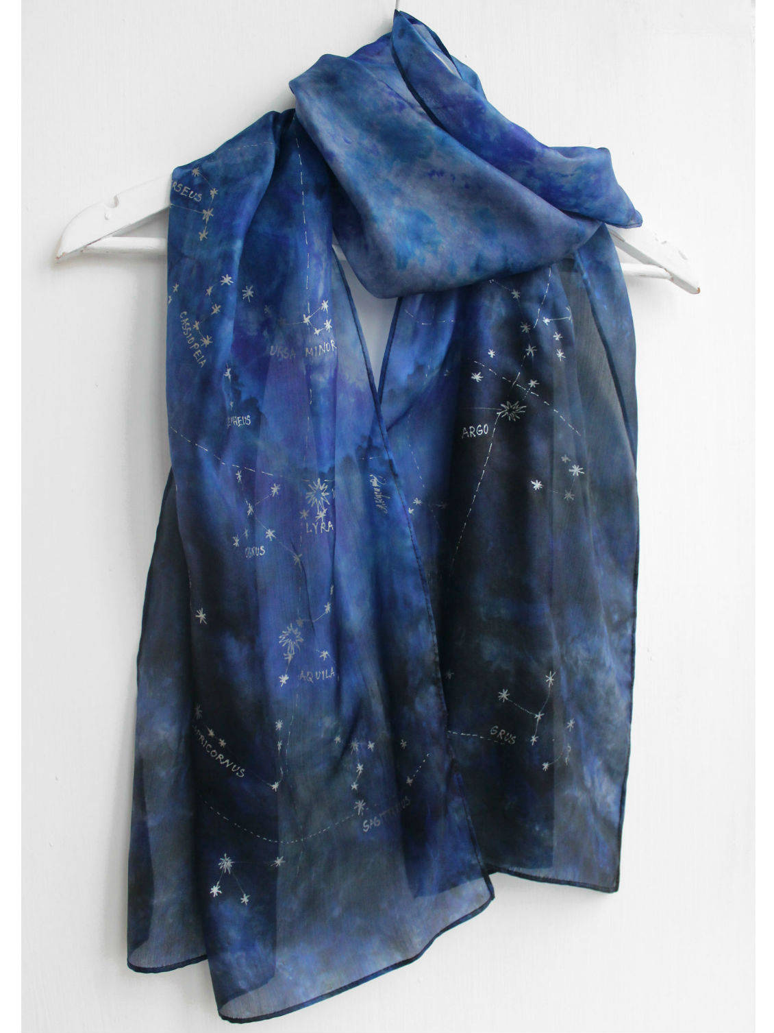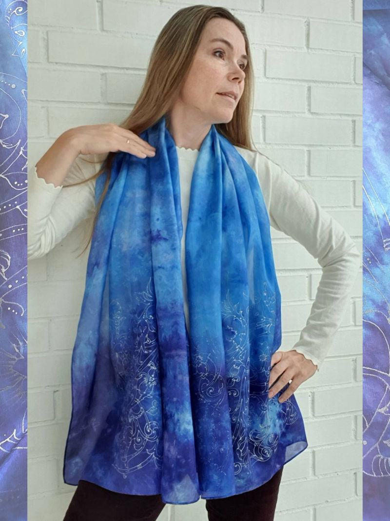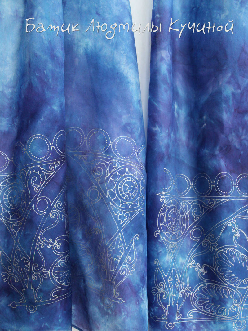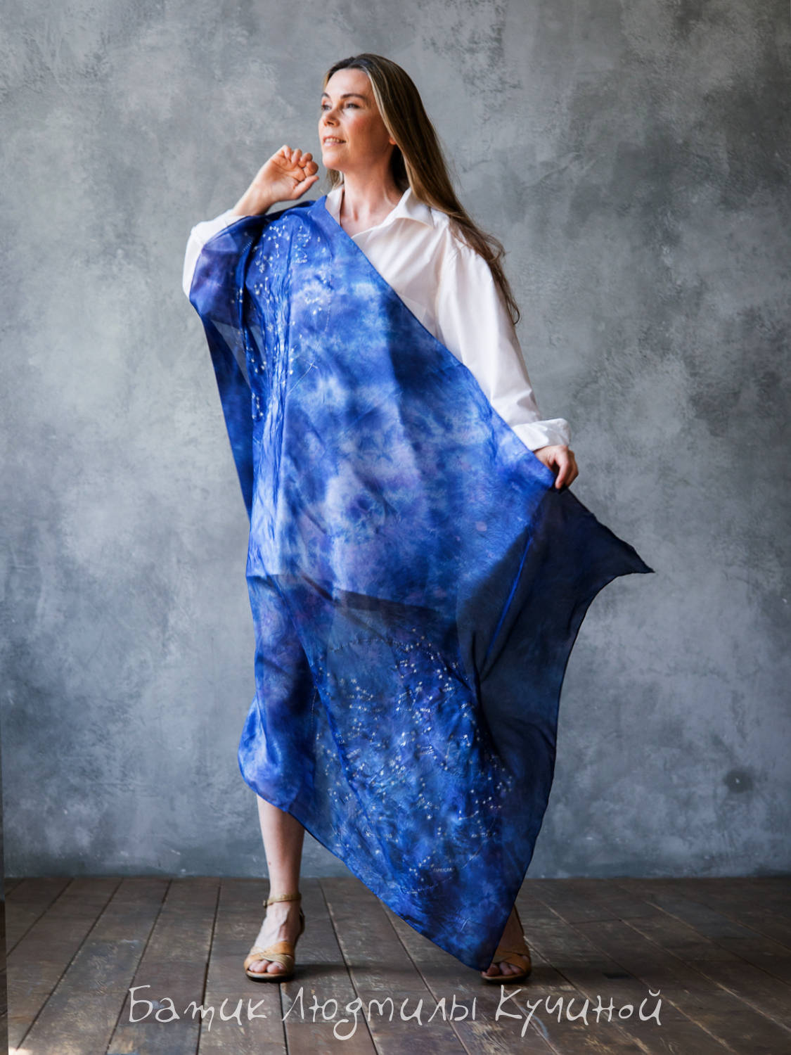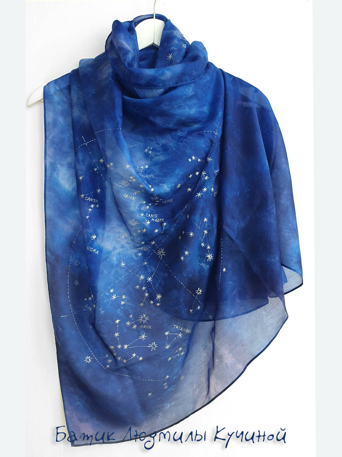 Батик шарф "Звездное Небо" (разная ширина), тонкий шелк эксцельсиор, серебристый контур. Звезды на двух сторонах разные. Повтор возможен в разных оттенках синего .
