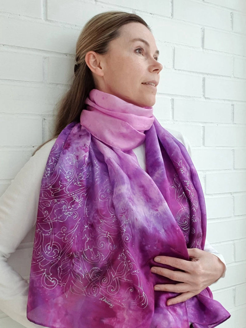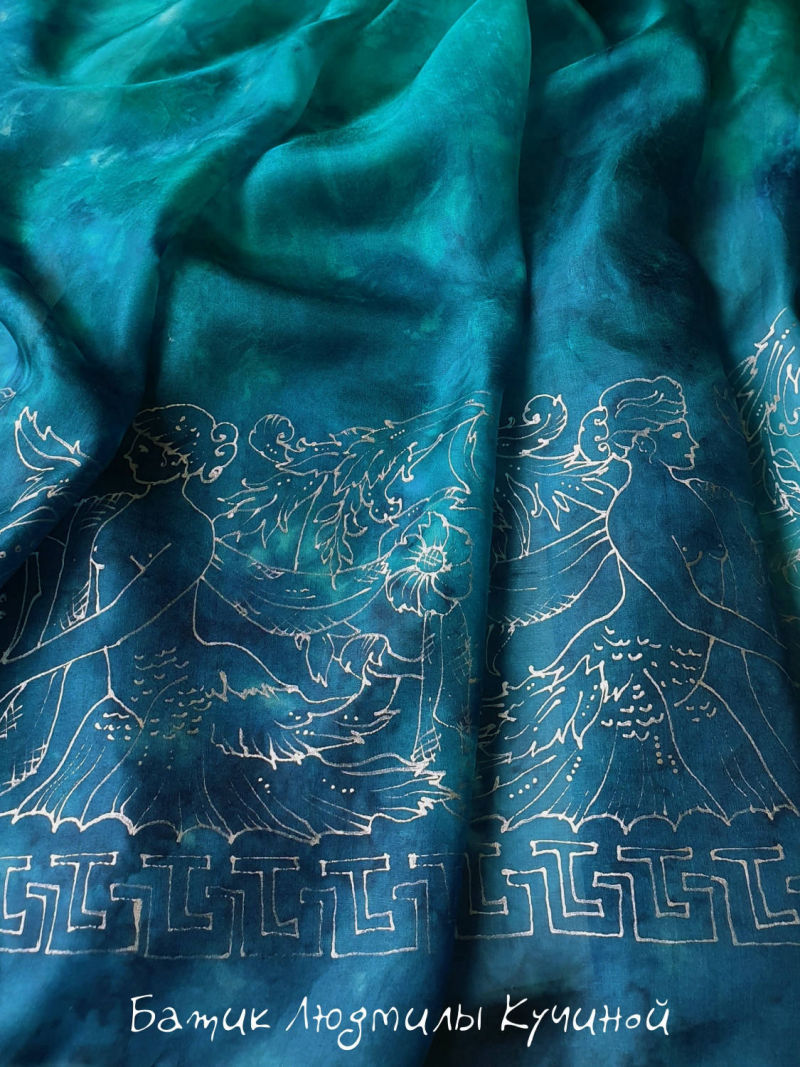 Батик шарф "Орнаменты Питера" ок . 172*67см, тонкий натуральный шелк эксцельсиор, серебристым контуром нанесен орнамент решетки Михайловского сада в Петербурге. Разные цветовые варианты.