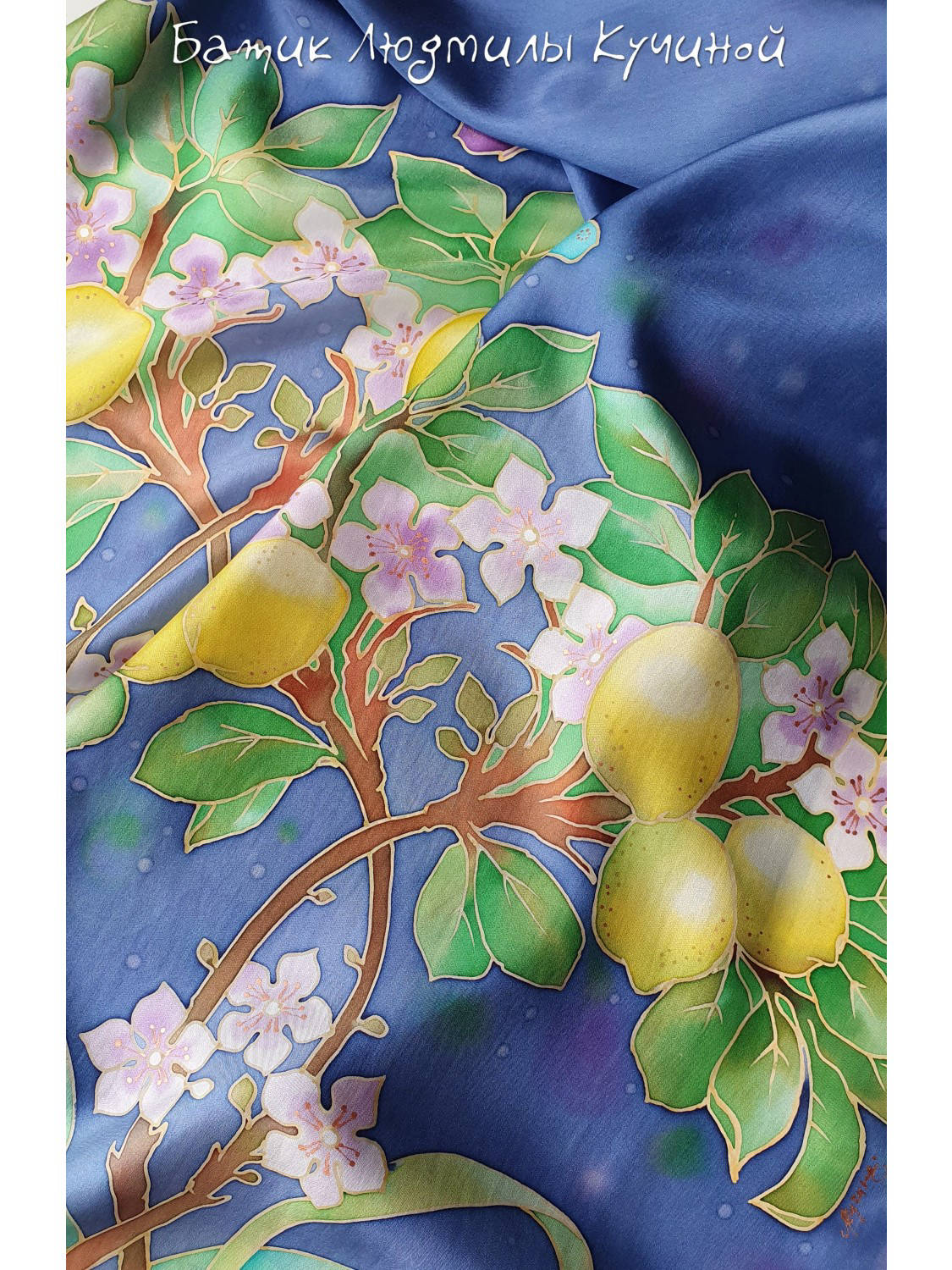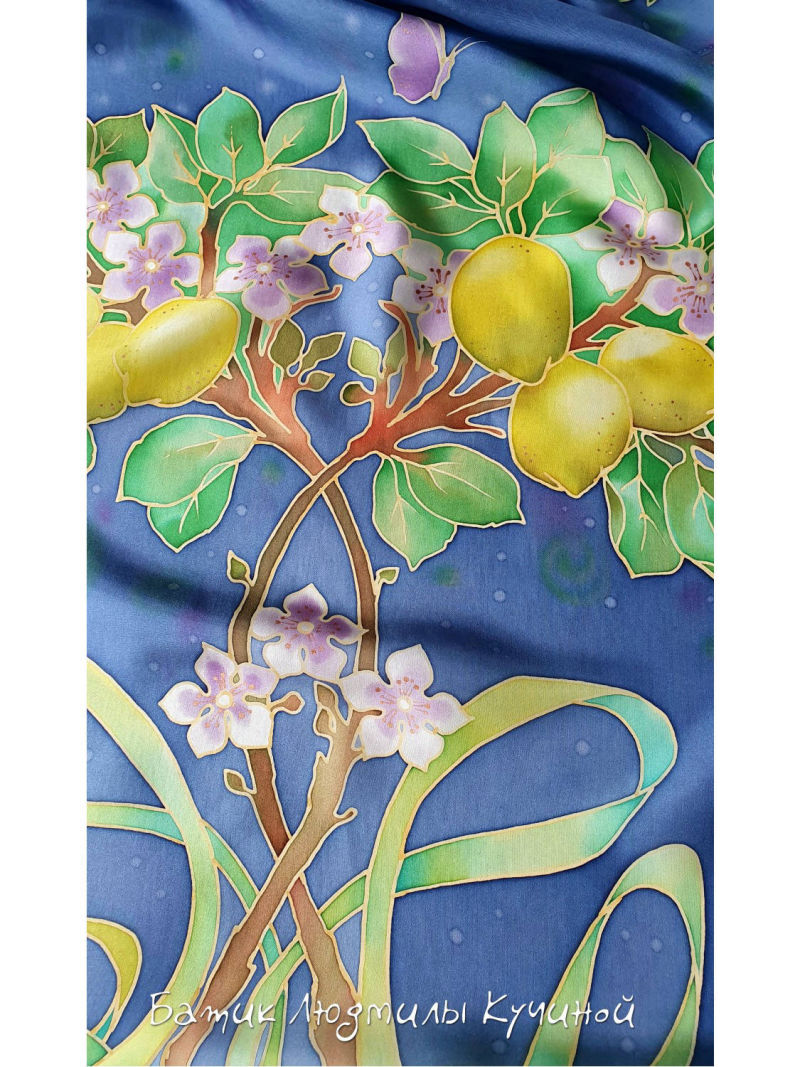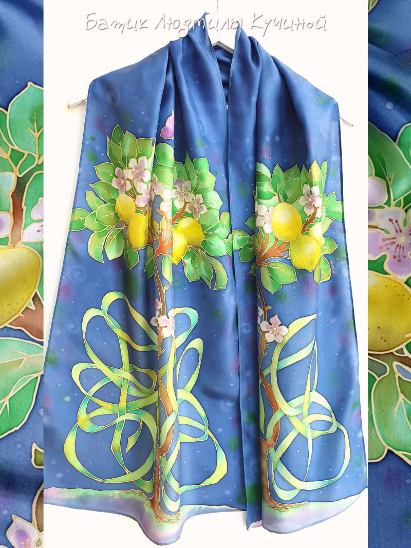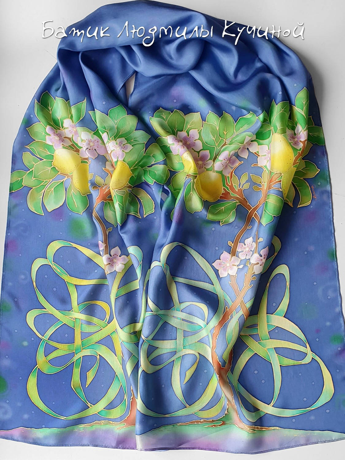 Батик шарф "Лимонное дерево Модерна" ок 170*45см, натуральный шелк туаль. Повтор возможен.