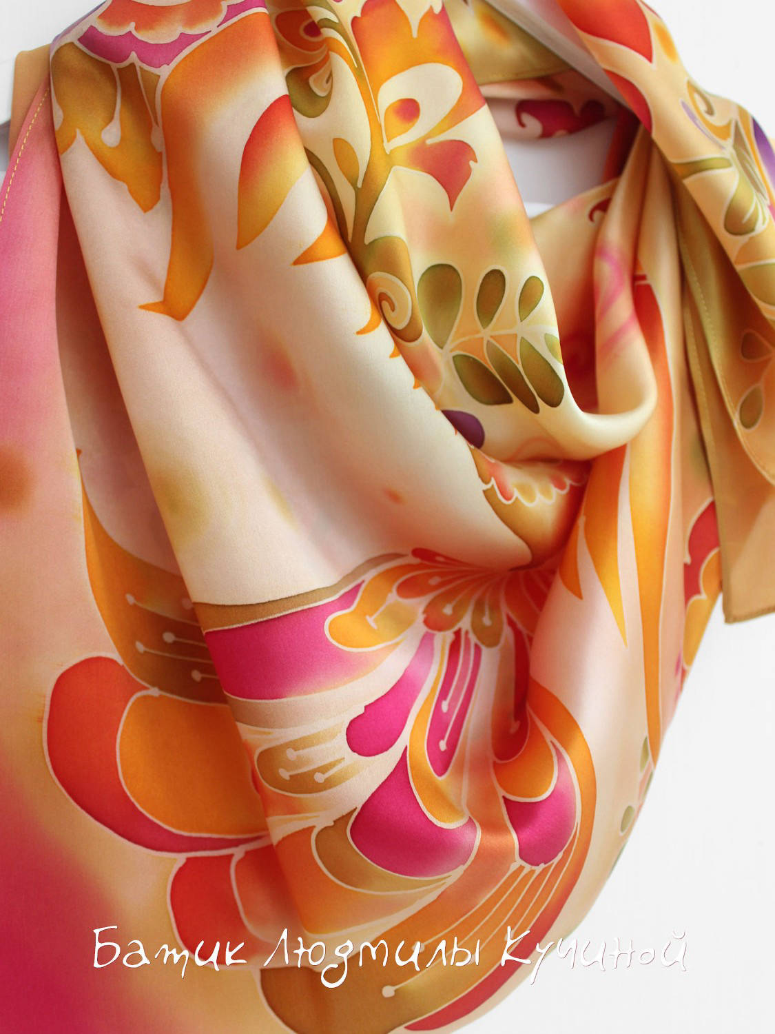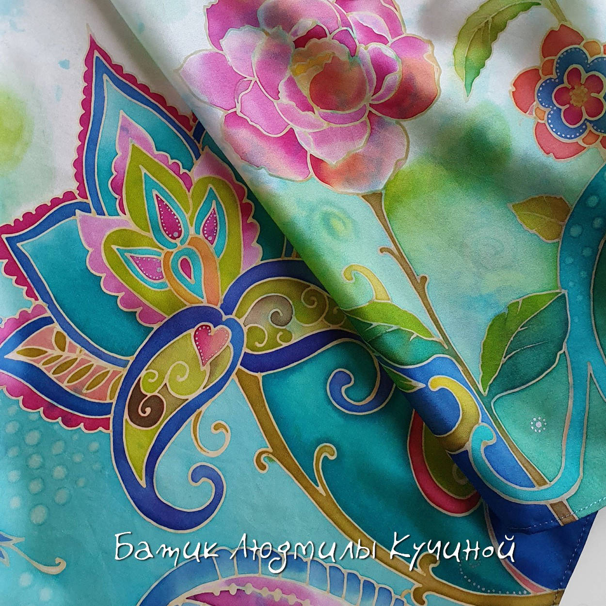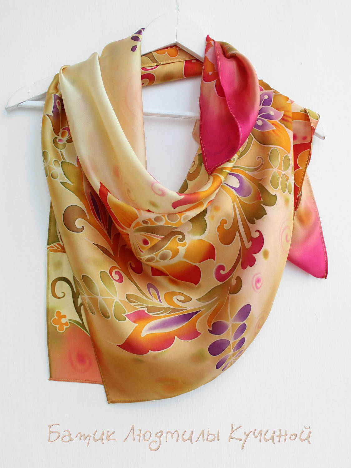 Батик платок "Жар-птица" , натуральный шелк туаль или атлас. Разные цветовые гаммы. Повтор возможен.