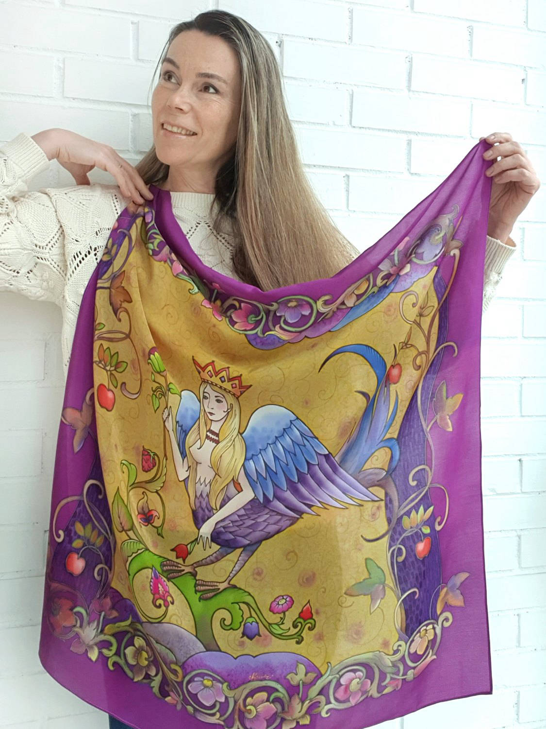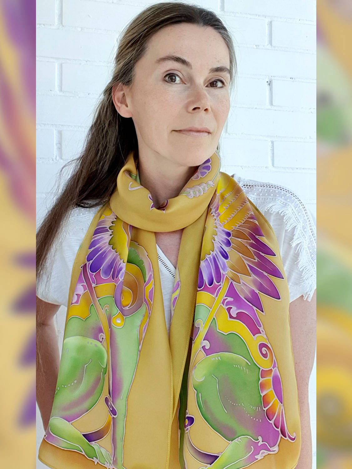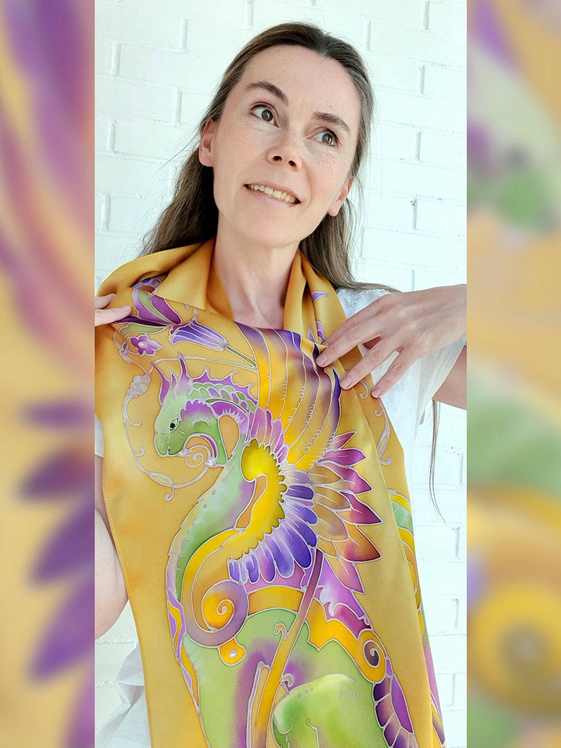 Батик шарф "Грифоны" ок . 164*29см, натуральный шелк атлас. Повтор возможен.