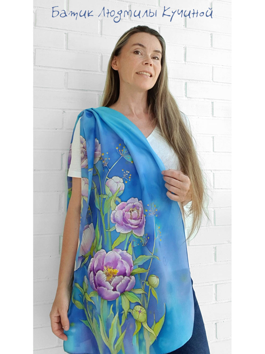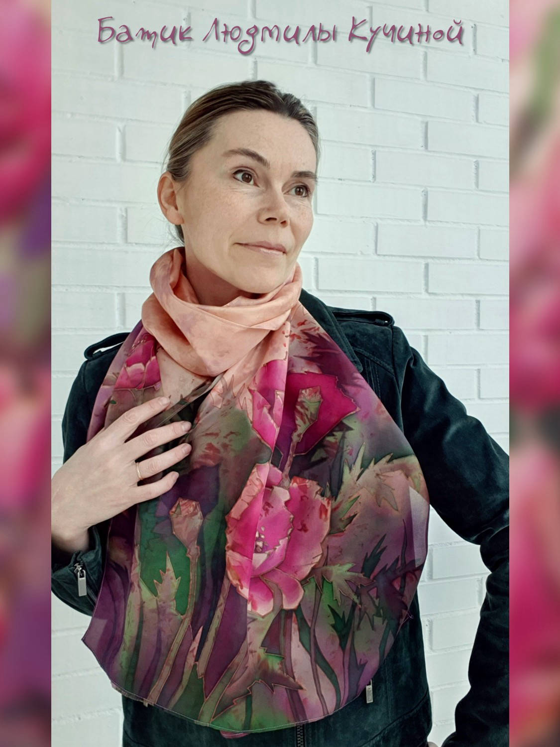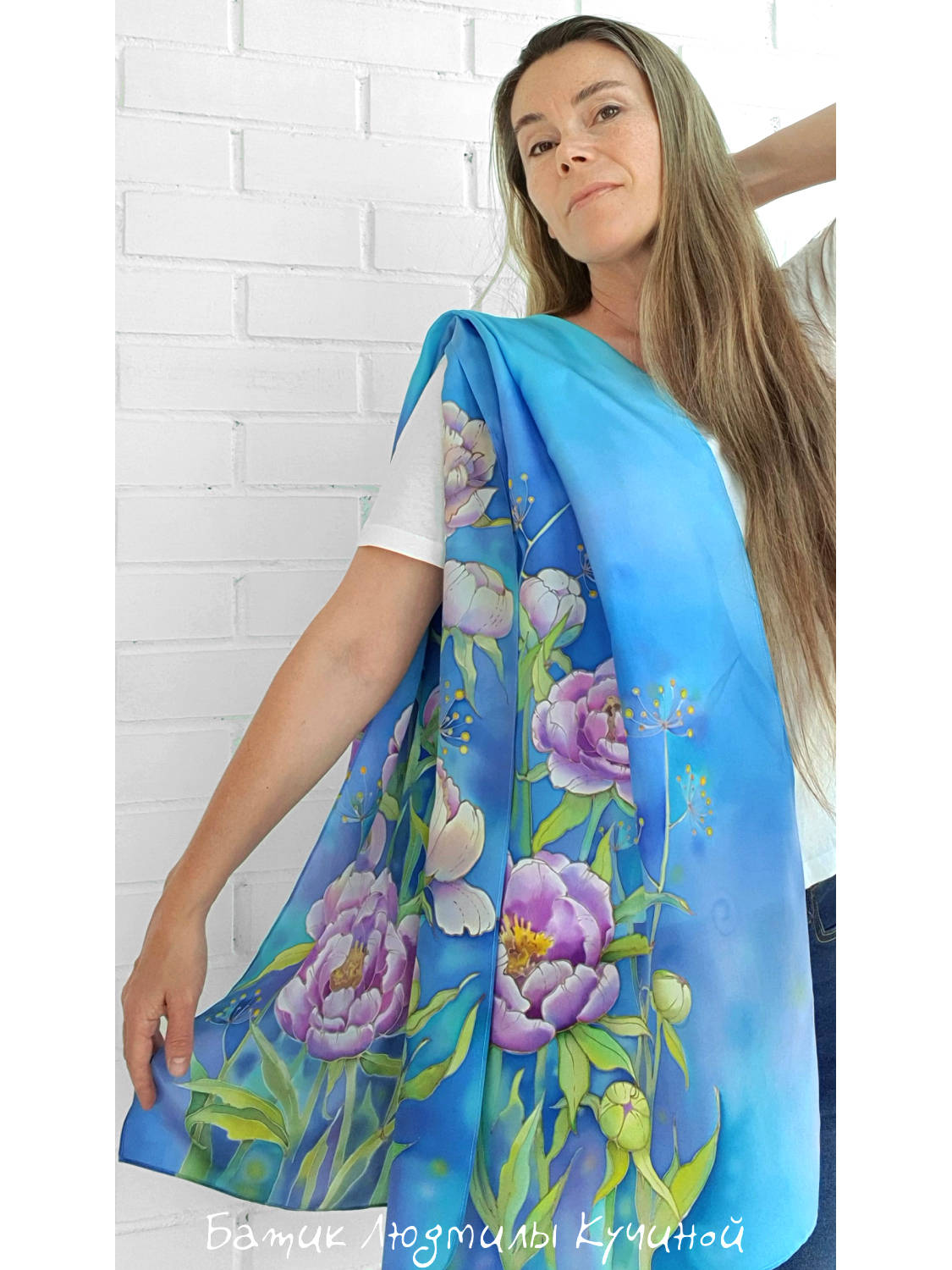 Батик шарф "Пионы" 158*49, натуральный шелк туаль.