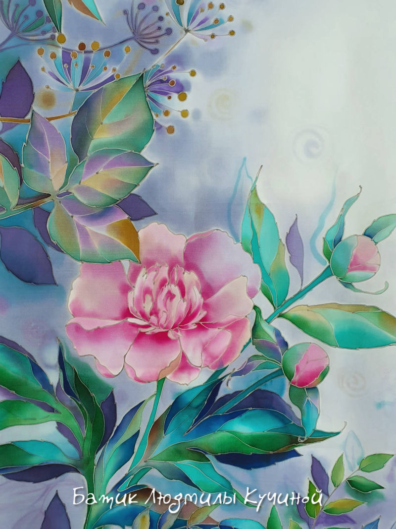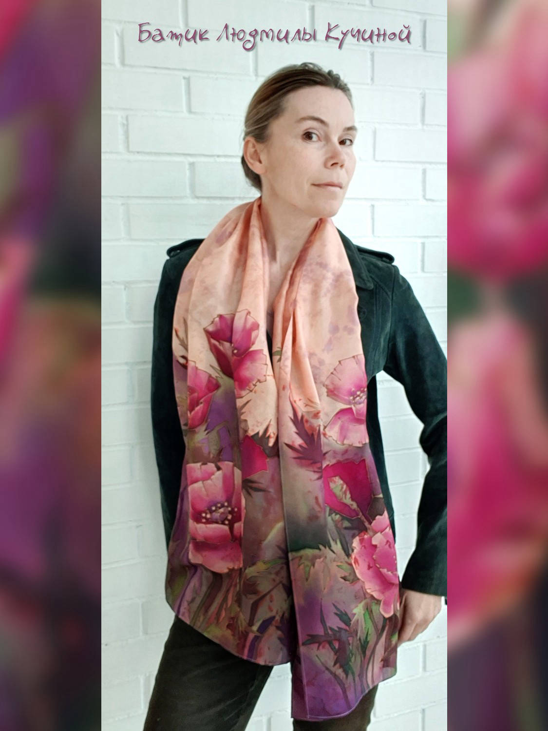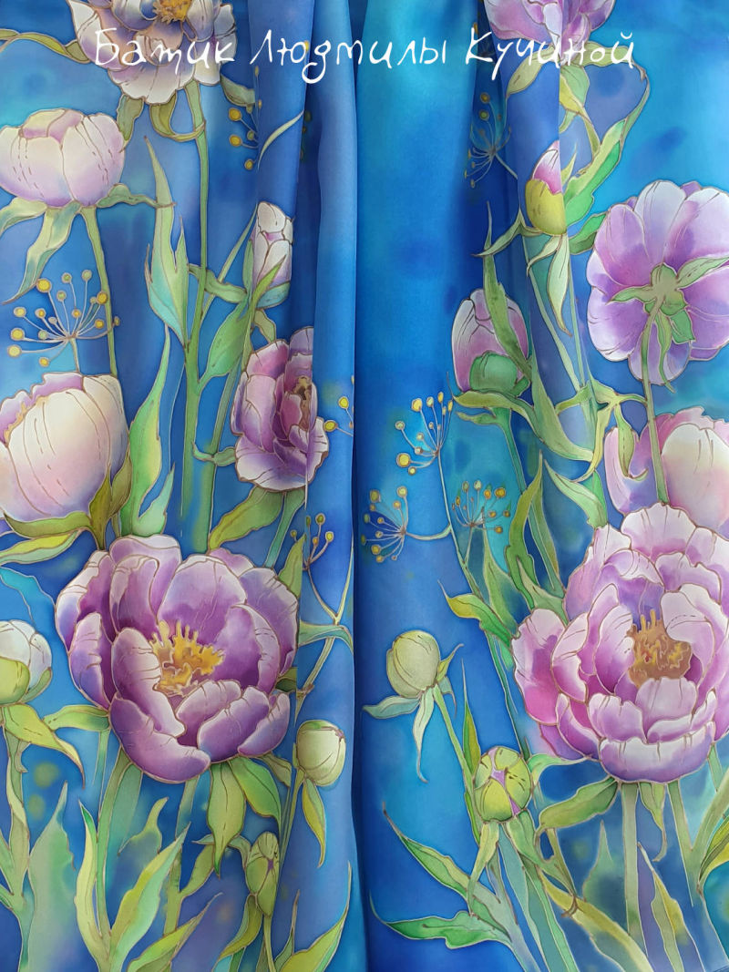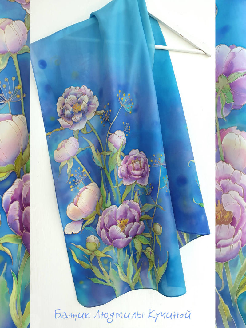Батик шарф "Пионы" 158*49, натуральный шелк туаль.