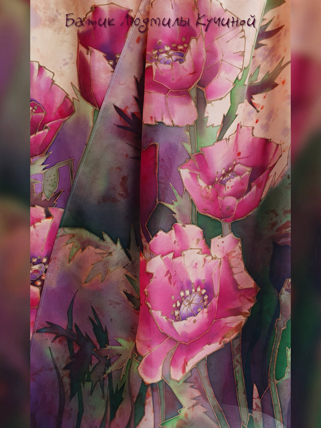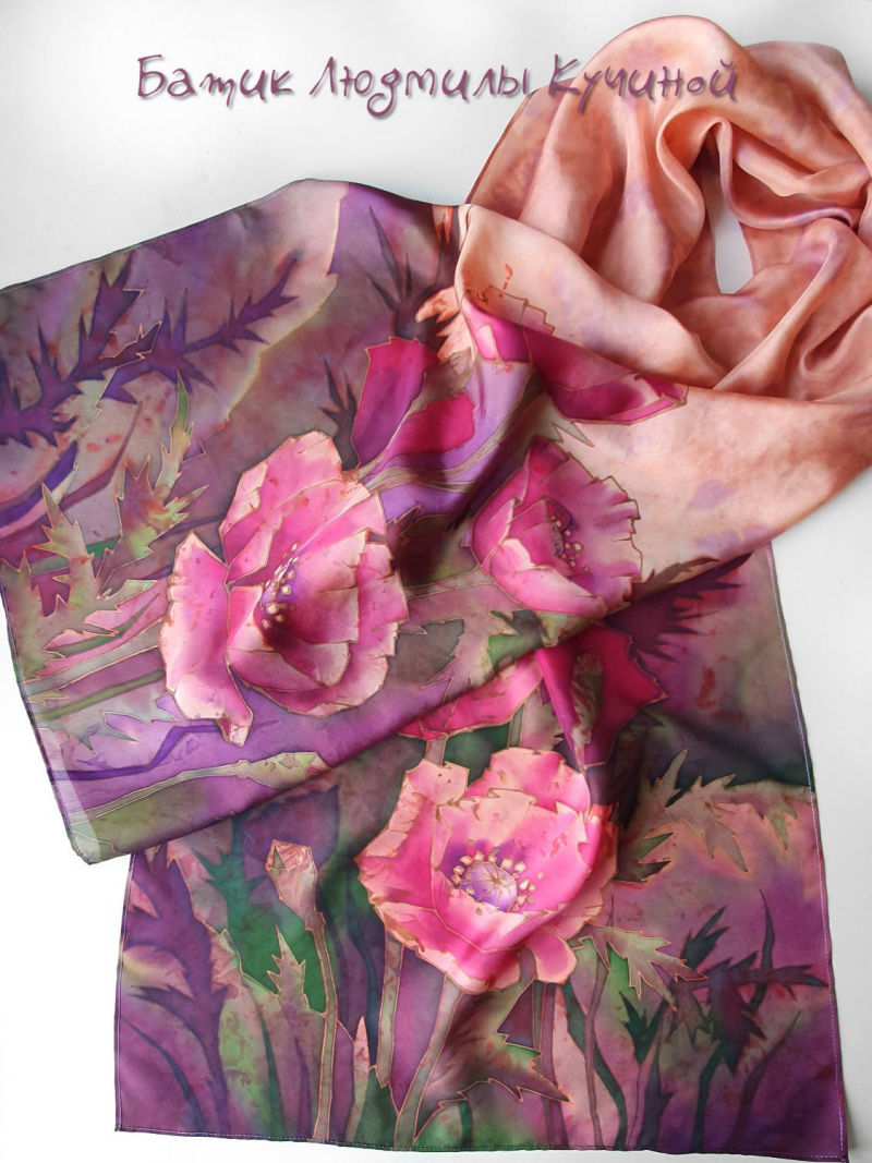Батик шарф "Маки в стиле гранж" - непредсказуемые , непричесанные цветы с хаотическими пятнами на фоне , 170*48 см натуральный шелк туаль. Повтор возможен только по мотивам.