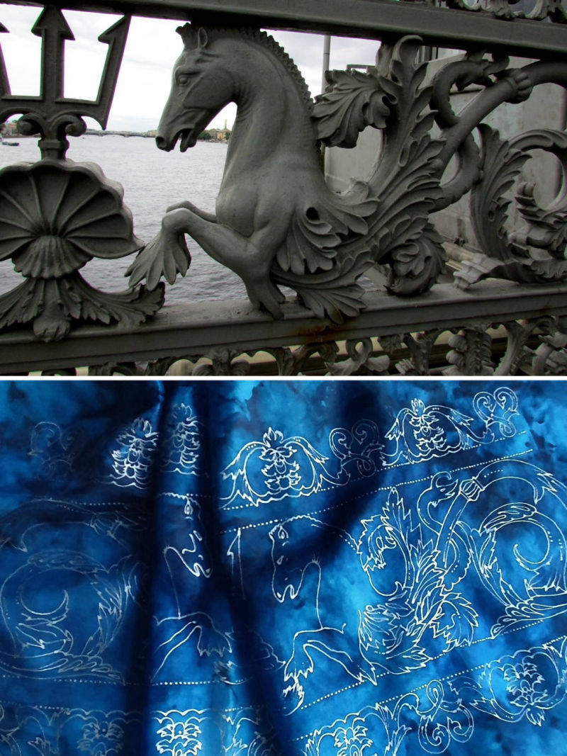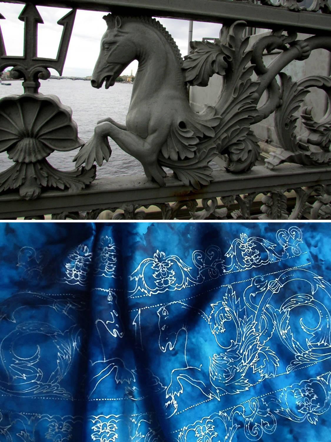 Батик шарф "Орнаменты Питера. Певческий Мост" ок. 170*68см, тонкий натуральный шелк эксцельсиор. На шарфе тонким серебристым контуром нанесен орнамент решетки Певческого моста в Петербурге. Повтор по мотивам возможен.