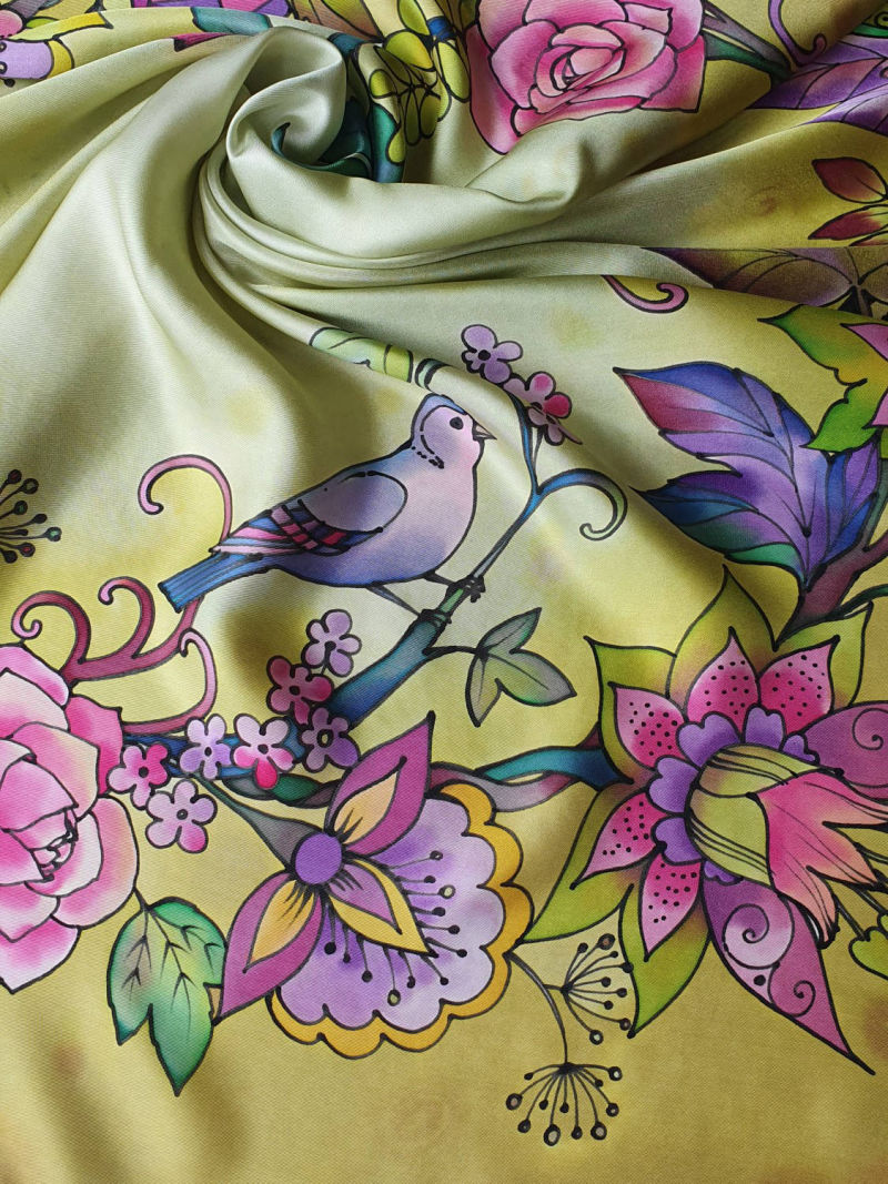 Батик платок "Весенний Сад" ок . 90*90см, натуральный шелк туаль, бронзовый контур на деталях.