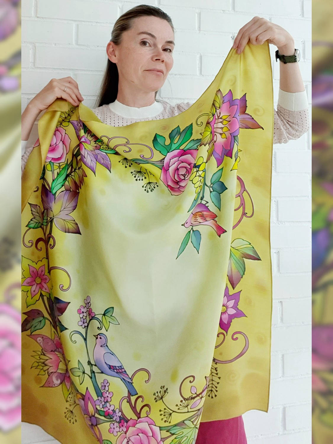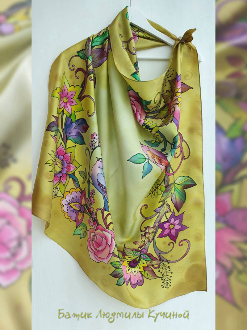 Батик платок "Венок с птицами" , 90*90 см натуральный шелк саржа (в мелкий рубчик). Повтор возможен.