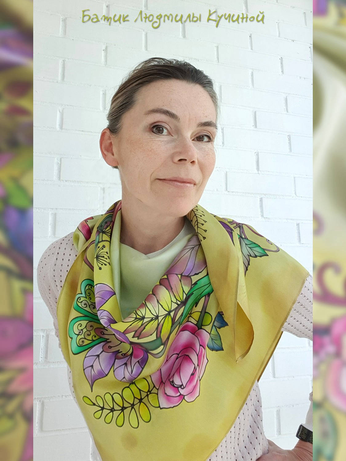 Батик платок "В моем саду" , натуральный шелк крепдешин. Повтор возможен по мотивам. Ок 90х90 см