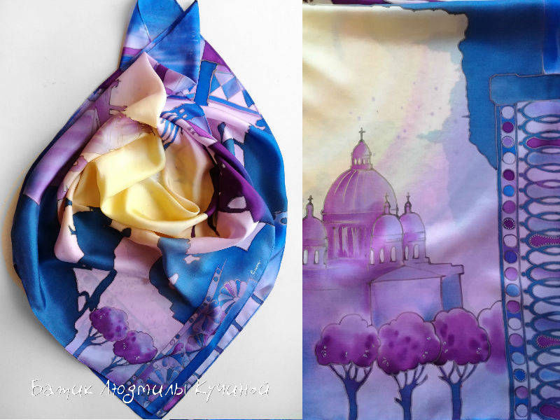 Батик платок "Белые ночи Петербурга" ок . 90*90см, натуральный шелк туаль, серебристый контур на деталях. Разные цветовые вариации. Повтор возможен.