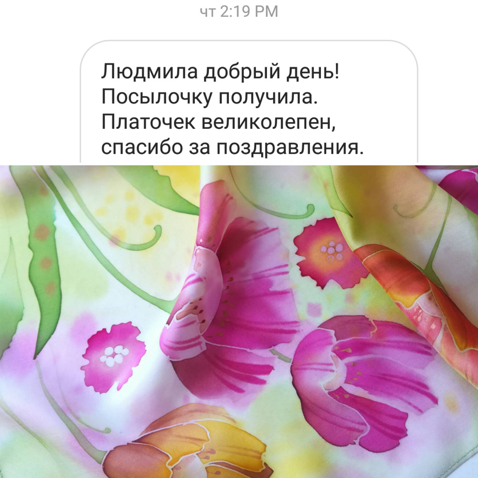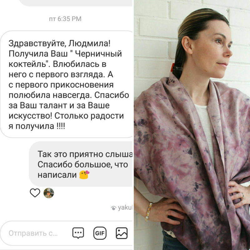 Огромная благодарность Людмиле!!! Чудесный шарф, тончайшая работа, исключительное качество, высокохудожественные цветовые решения и доброжелательное отношение, удачи Вам, новых задумок и их исключительного исполнения, С уважением и благодарностью, Елена