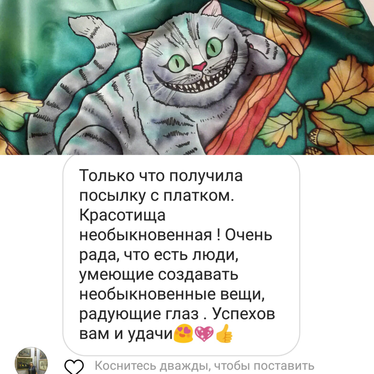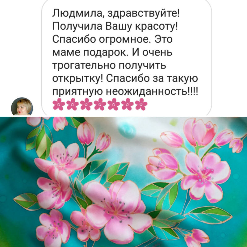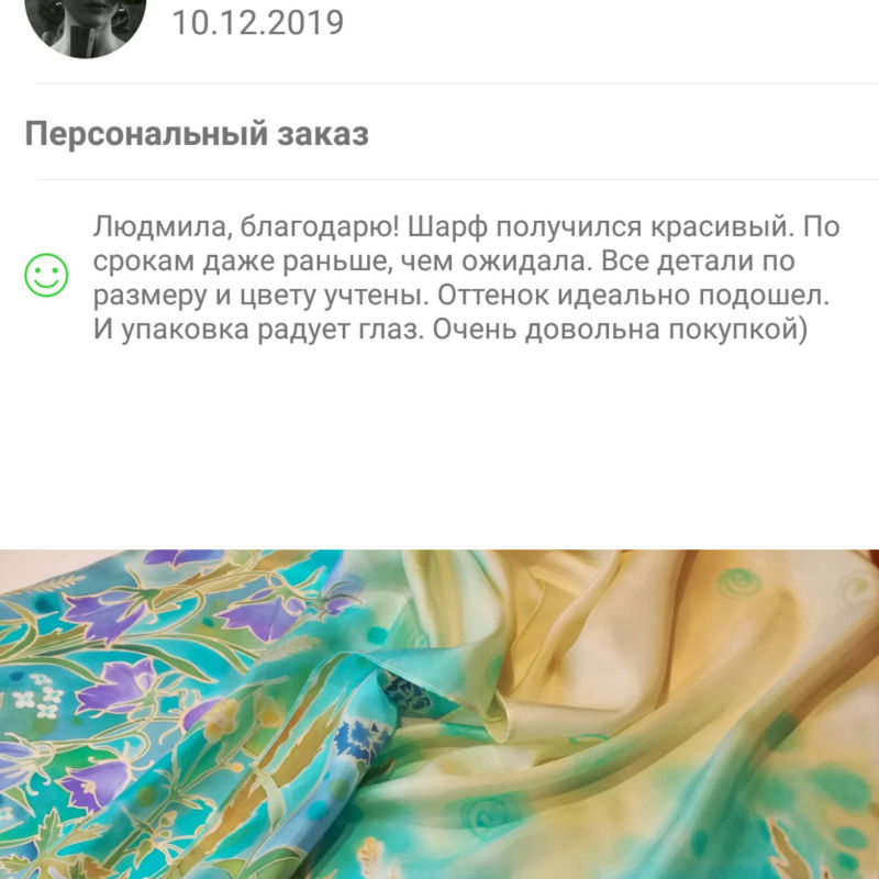 Большое спасибо Мастеру за прекрасное изделие! Утонченный рисунок выполнен безупречно. Шарфик вызывает доброе, светлое чувство. Очень довольна контактом с мастером, при котором были учтены все мои желания, и доставкой изделия. Буду носить шарфик не только с удовольствием, но и с благодарностью. Рекомендую заглянуть к Людмиле в ее магазинчик. Порадуйте себя и своих близких!