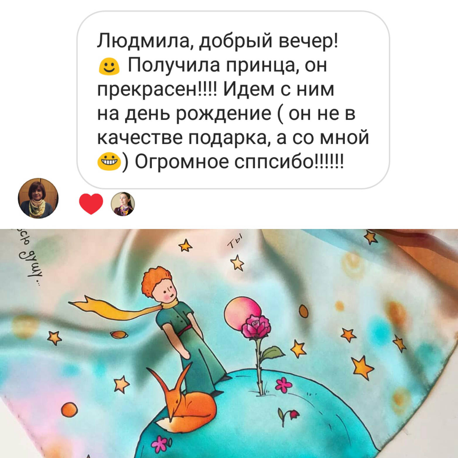 Хочу поблагодарить Людмилу за работу! Заказывала платок с "Маленьким принцем". Людмила внесла изменения по моему желанию, все было сделано на отлично! Спасибо большое за терпение и мастерство!