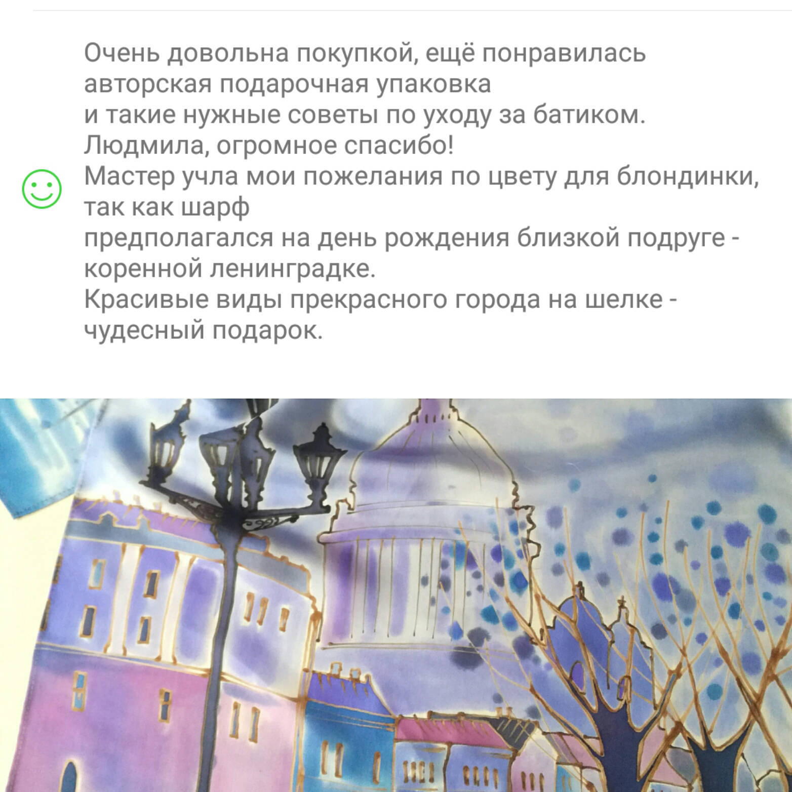 Спасибо за тонкую, изящную работу! Шарф сделан в срок, с учётом моих просьб по рисунку! Очень благодарна Людмиле и надеюсь как - нибудь сделать ещё заказ у этого мастера