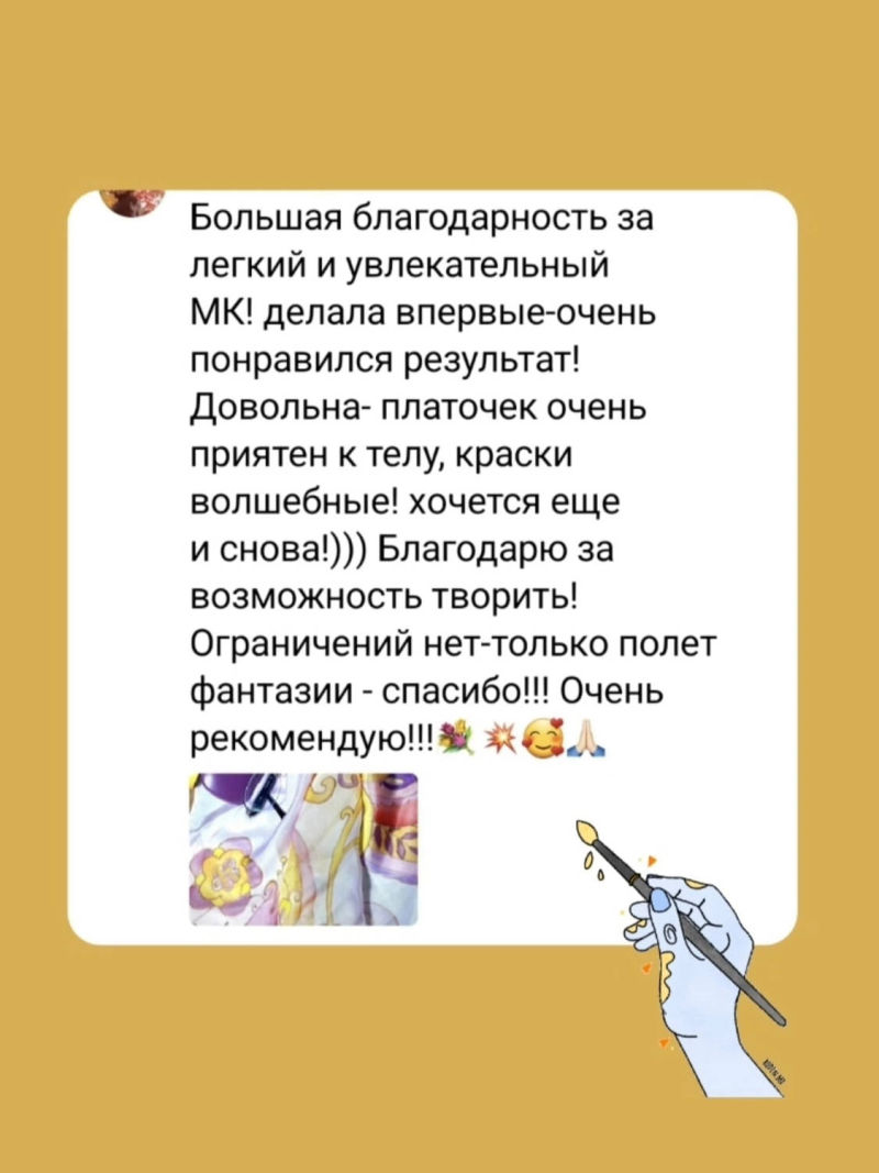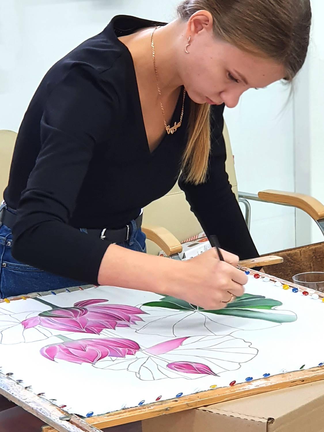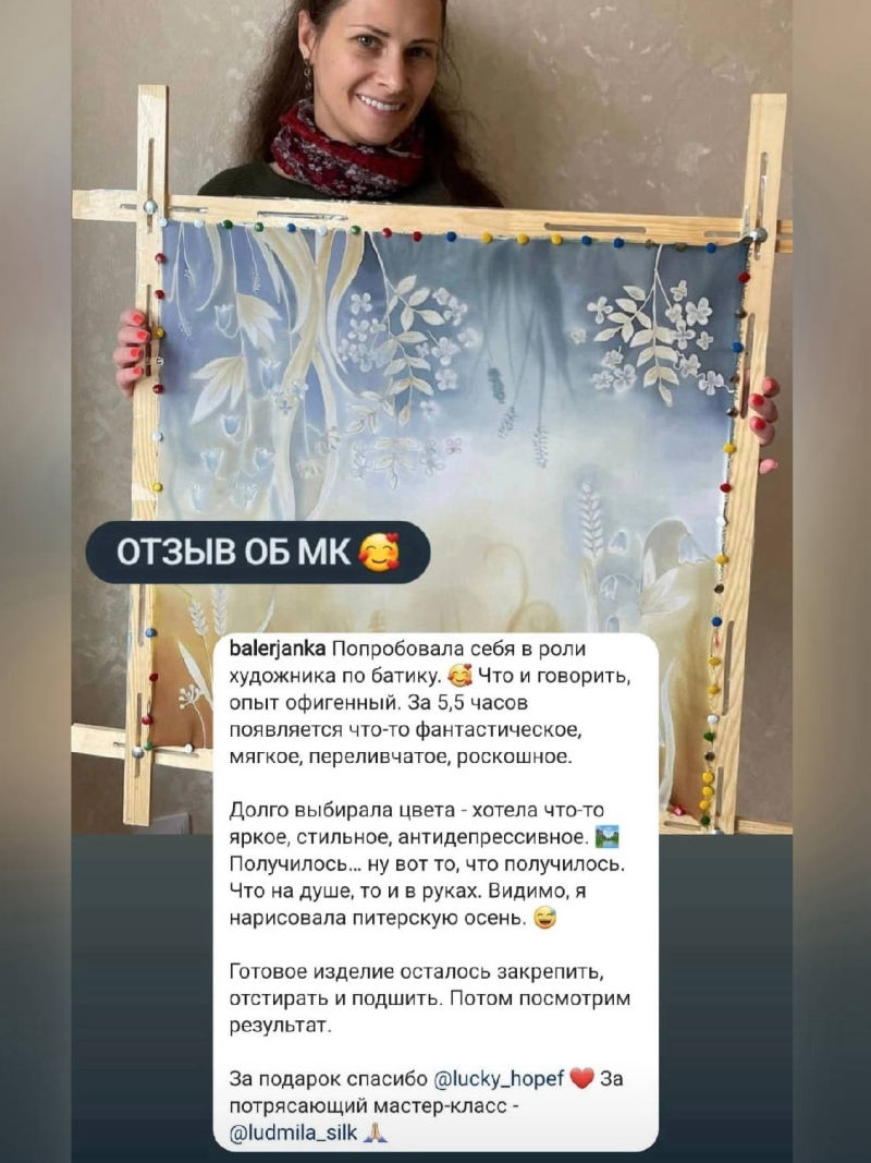 Мы работаем 4-5 часов, после росписи краски необходимо закрепить - я это делаю на профессиональном оборудовании, после подшиваю и отдаю через пару дней вам.