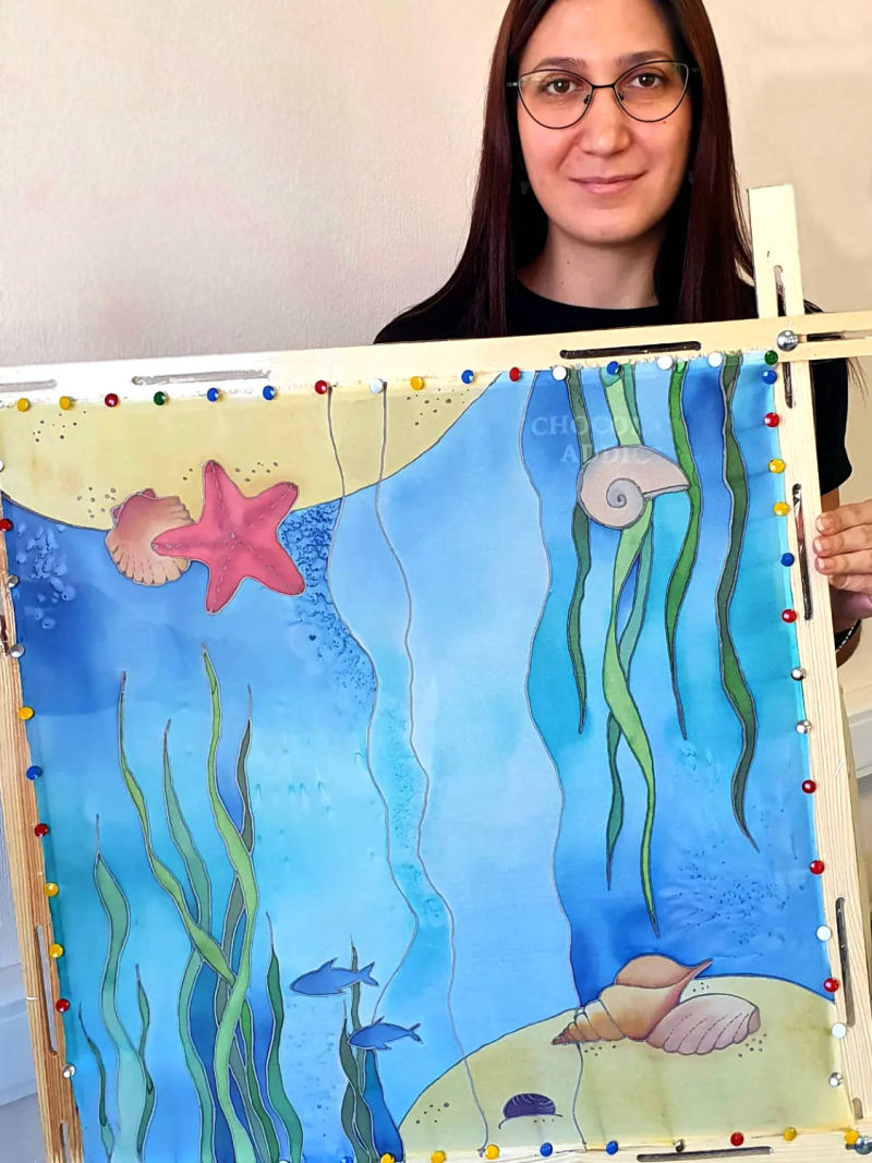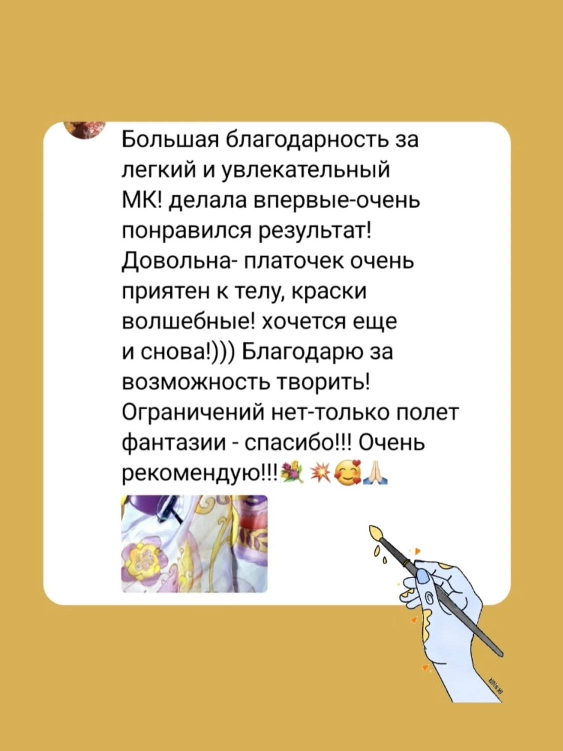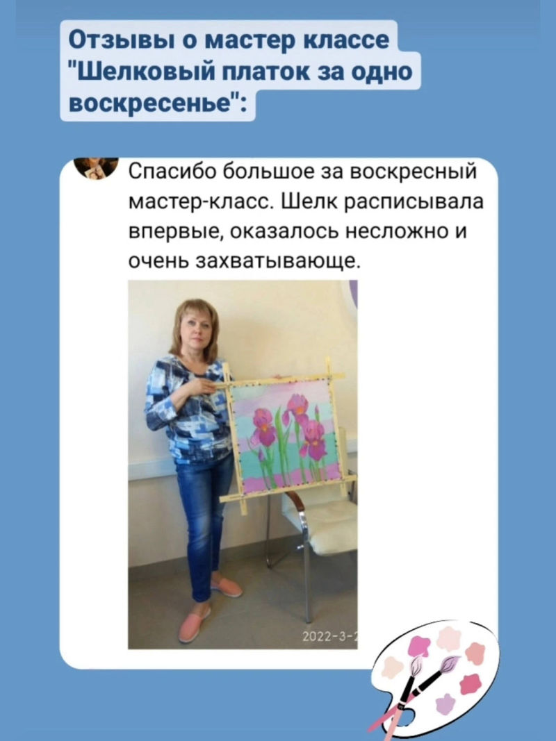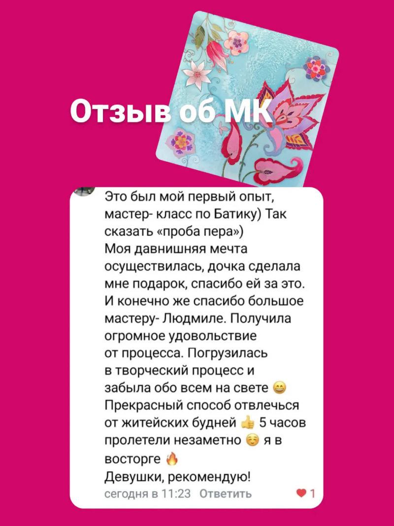 Мы работаем 4-5 часов, после росписи краски необходимо закрепить - я это делаю на профессиональном оборудовании, после подшиваю и отдаю через пару дней вам.